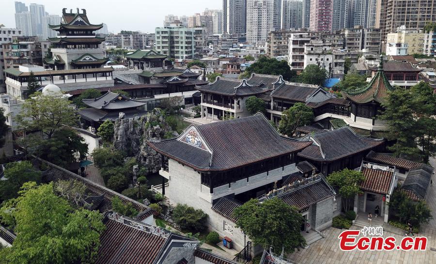 Photo shows the buildings at Guangzhou's Cantonese Opera Art Museum built in traditional Lingnan style, in Guangzhou, South China's Guangdong Province, May 27, 2020. Rockeries are reflected in ponds brimming with koi. Pagodas line cobblestone paths. Buildings are constructed according to local traditions, with white walls beneath eaves that curl at the corners like claws. (Photo/China News Service)