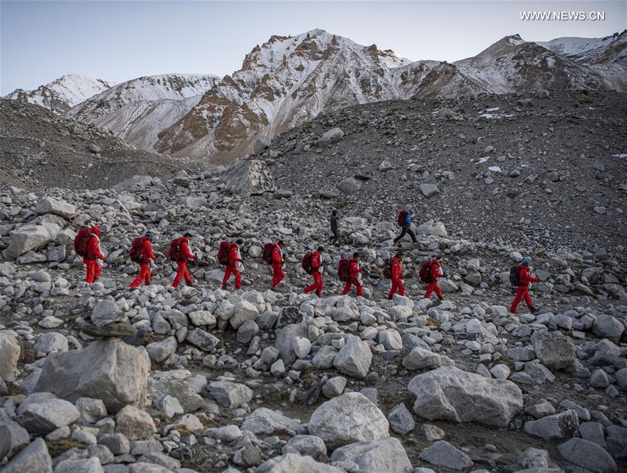 Members of a Chinese surveying team are on the way back to the Mount Qomolangma base camp on May 28, 2020. A Chinese surveying team safely descended to the Mount Qomolangma base camp at an altitude of 5,200 meters Thursday, after completing the mission of remeasuring the height of the world's highest peak. (Xinhua/Sun Fei)