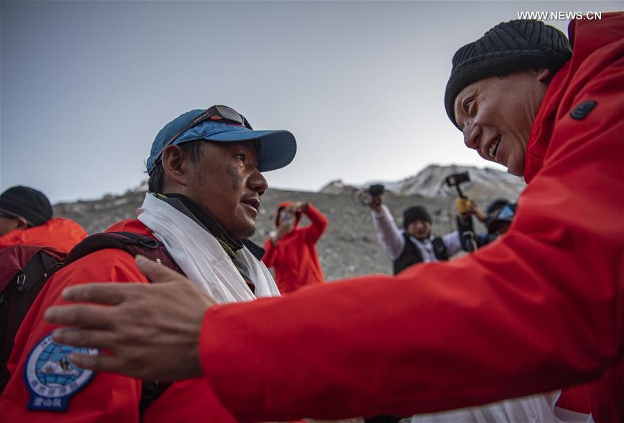 The leader of a Chinese surveying team Tsenor (L) receives congratulations after the team completed the mission of remeasuring the height of Mount Qomolangma and safely descended to the Mount Qomolangma base camp, on May 28, 2020. A Chinese surveying team safely descended to the Mount Qomolangma base camp at an altitude of 5,200 meters Thursday, after completing the mission of remeasuring the height of the world's highest peak. (Xinhua/Sun Fei)