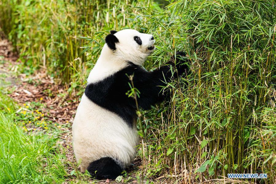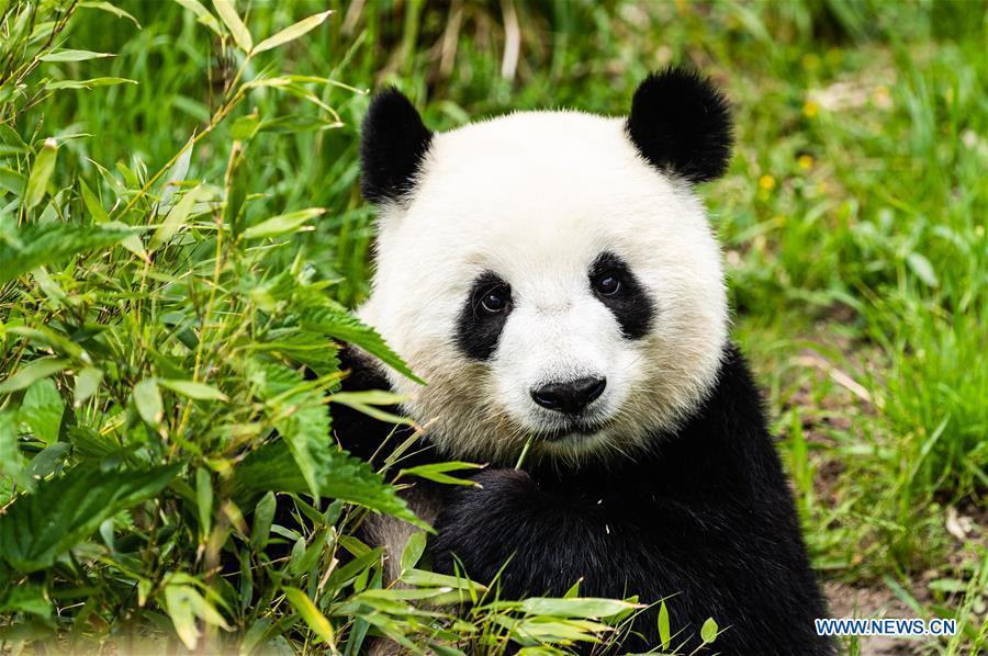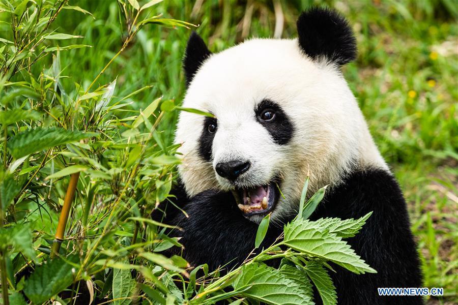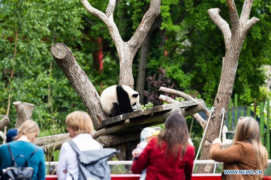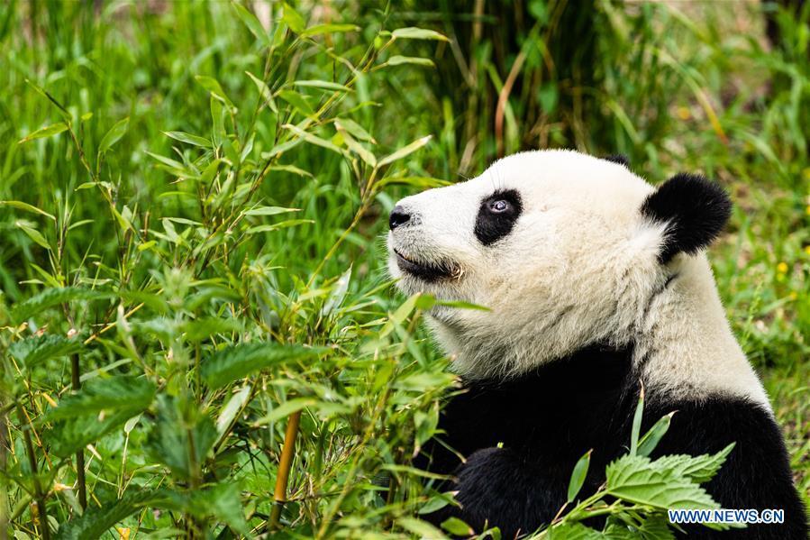 Giant panda "Meng Meng" is seen at Zoo Berlin in Berlin, capital of Germany, May 28, 2020. Zoo Berlin reopened to the public on April 28 after a closure for more than a month due to COVID-19. Giant pandas "Meng Meng", "Jiao Qing" from China and their twin cubs "Meng Xiang", "Meng Yuan" have attracted numerous visitors though restrictions are still imposed in the zoo. (Photo by Binh Truong/Xinhua)
