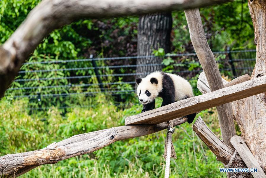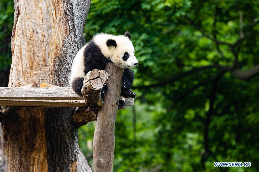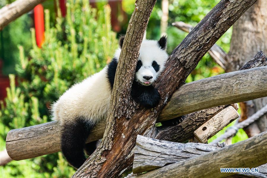 A giant panda cub plays at Zoo Berlin in Berlin, capital of Germany, May 28, 2020. Zoo Berlin reopened to the public on April 28 after a closure for more than a month due to COVID-19. Giant pandas "Meng Meng", "Jiao Qing" from China and their twin cubs "Meng Xiang", "Meng Yuan" have attracted numerous visitors though restrictions are still imposed in the zoo. (Photo by Binh Truong/Xinhua)