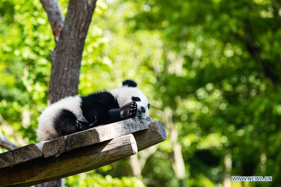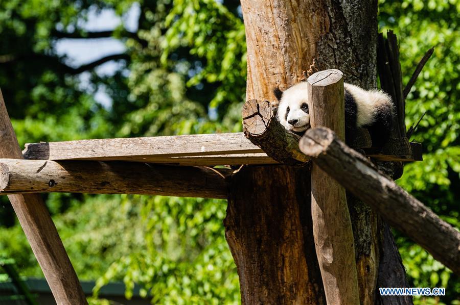 A giant panda cub rests at Zoo Berlin in Berlin, capital of Germany, May 28, 2020. Zoo Berlin reopened to the public on April 28 after a closure for more than a month due to COVID-19. Giant pandas "Meng Meng", "Jiao Qing" from China and their twin cubs "Meng Xiang", "Meng Yuan" have attracted numerous visitors though restrictions are still imposed in the zoo. (Photo by Binh Truong/Xinhua)