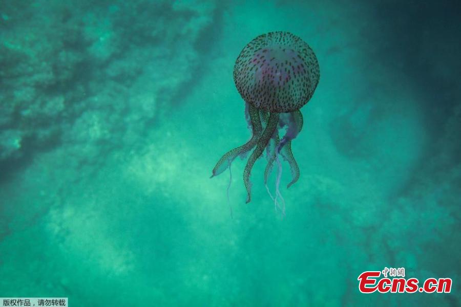 Photo taken on May 27, 2020, at a depth of five metres off the coast Lebanon's northern town of Qalamun shows a Pelagia noctiluca (Medusa luminosa).