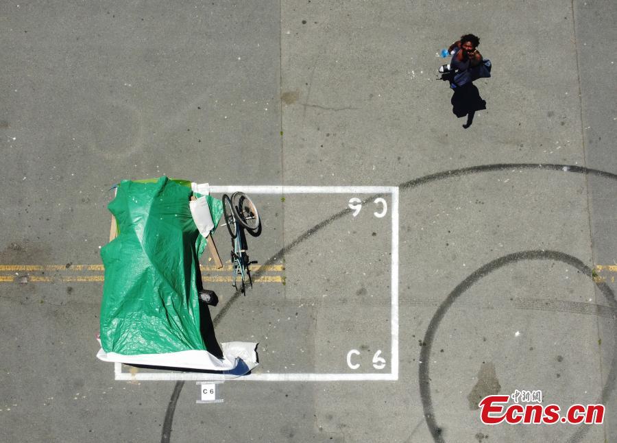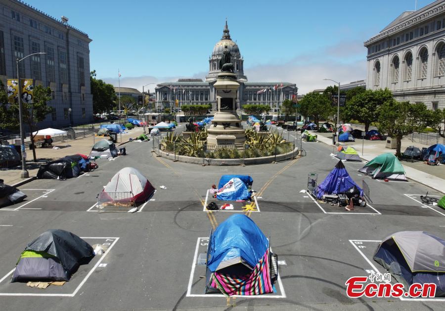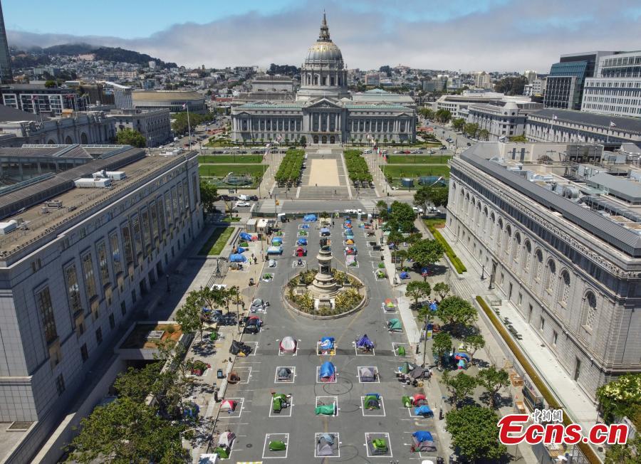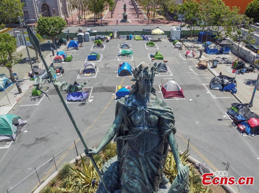 Tents are pitched using social distancing to help slow the spread of coronavirus disease (COVID-19) at a homeless encampment christened Safe Sleeping Village in a square next to city hall in San Francisco, California, U.S. May 28, 2020. (Photo: China News Service/Liu Guanguan)