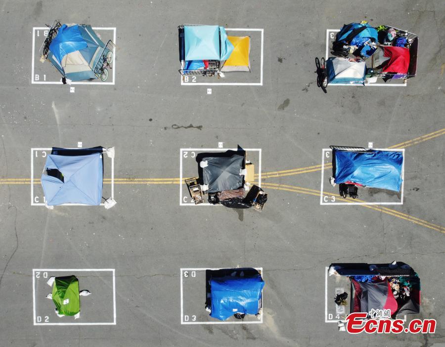 An aerial view of San Francisco's first temporary sanctioned tent encampment for the homeless in San Francisco, California, May 28, 2020. (Photo: China News Service/Liu Guanguan)