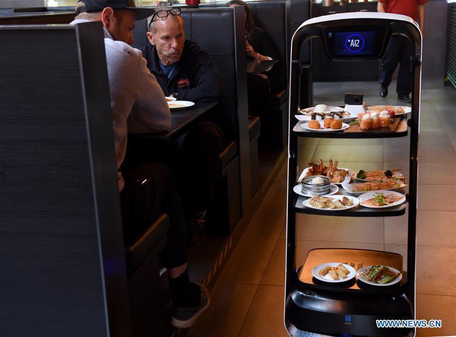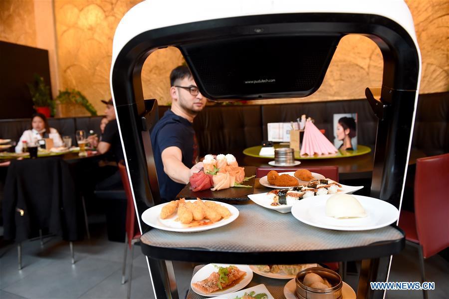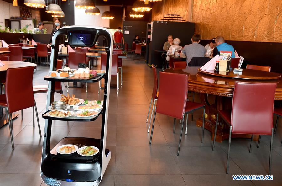 A robot delivers meals at an Asian restaurant in Vienna, Austria, on May 28, 2020. An Asian restaurant in Vienna uses robots to deliver meals in order to reduce unnecessary contact between waiters and customers during the COVID-19 outbreak. (Xinhua/Guo Chen)