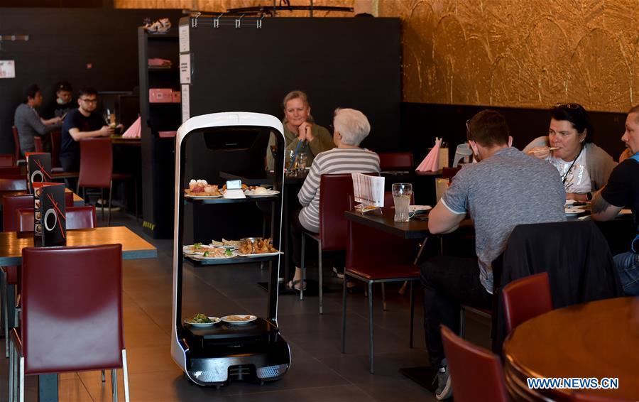 A robot delivers meals to customers at an Asian restaurant in Vienna, Austria, on May 28, 2020. An Asian restaurant in Vienna uses robots to deliver meals in order to reduce unnecessary contact between waiters and customers during the COVID-19 outbreak. (Xinhua/Guo Chen)
