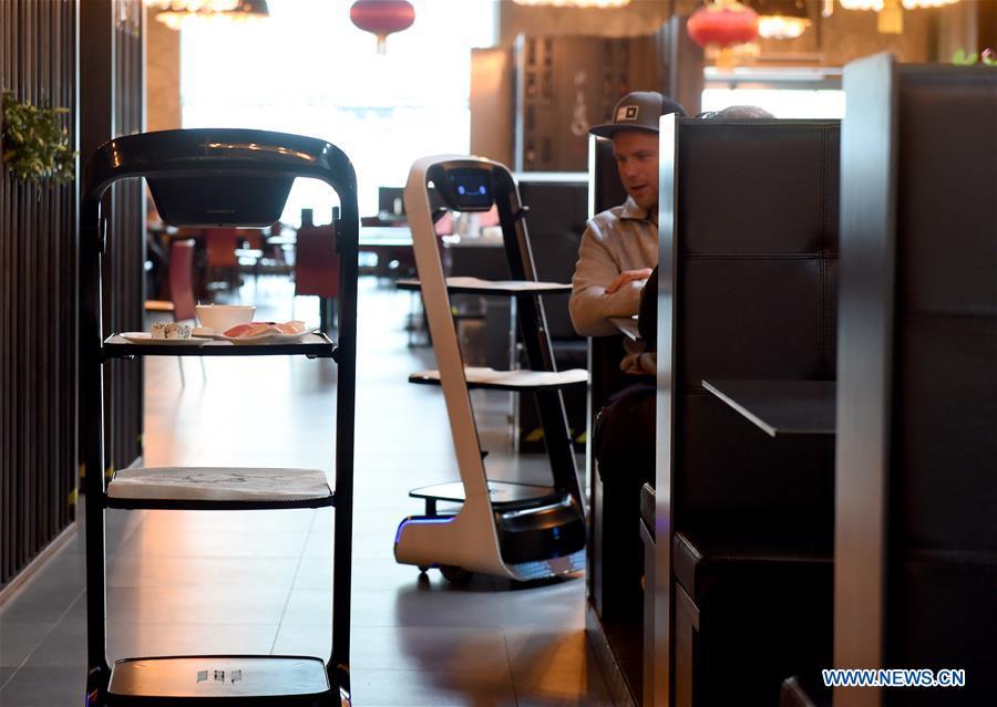 Robots deliver meals at an Asian restaurant in Vienna, Austria, on May 28, 2020. An Asian restaurant in Vienna uses robots to deliver meals in order to reduce unnecessary contact between waiters and customers during the COVID-19 outbreak. (Xinhua/Guo Chen)