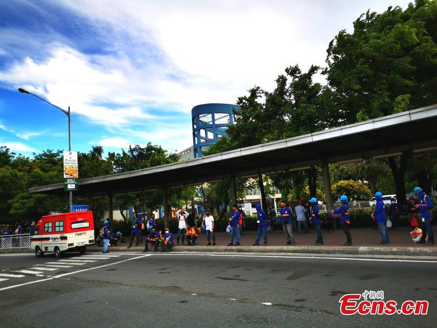 Photo taken on June 1, 2020 shows workers keep social distance, waiting for the commuter bus in Manila, capital of the Philippines. Philippine President Rodrigo Duterte on May 28 announced to further ease lockdown restrictions in Metro Manila from June 1 to allow more businesses and transport to reopen. (Photo: China News Service/Guan Xiangdong)