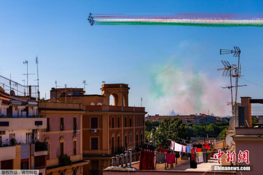 The Italian Frecce Tricolori (Tricolor Arrows) aerobatics team fly over Rome on the occasion of Republic Day in Italy, on June 2, 2020. (Photo/Agencies)