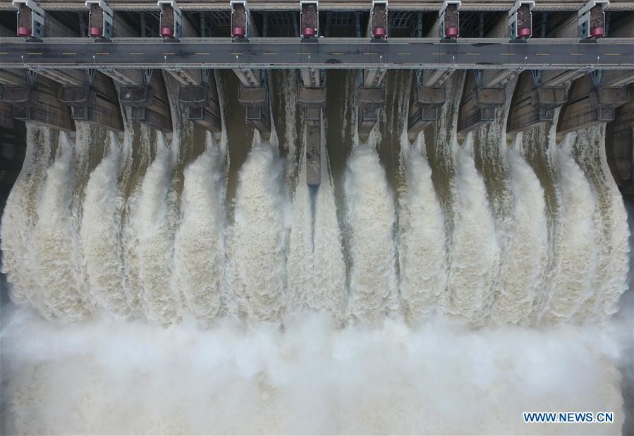 Photo taken on June 6, 2020 shows Shuikou Hydropower Station opening its sluices for water discharge due to days of rainfalls on the upper reaches of Minjiang River in Minqing County, southeast China's Fujian Province. (Xinhua/Lin Shanchuan)