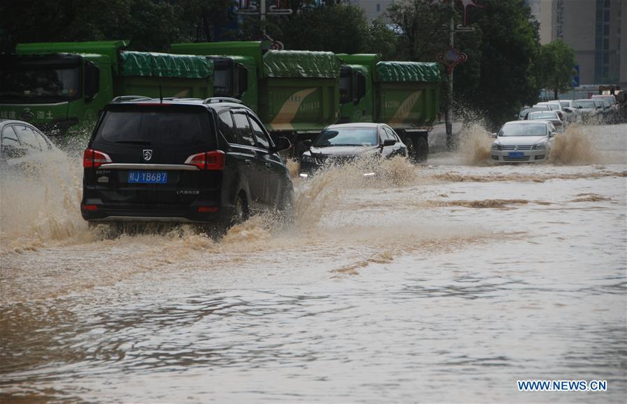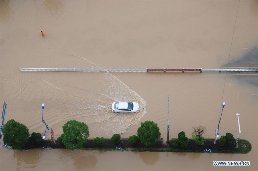 A vehicle makes its way through a flooded road in Hezhou, south China's Guangxi Zhuang Autonomous Region, June 7, 2020.(Photo by Liao Zuping/Xinhua)