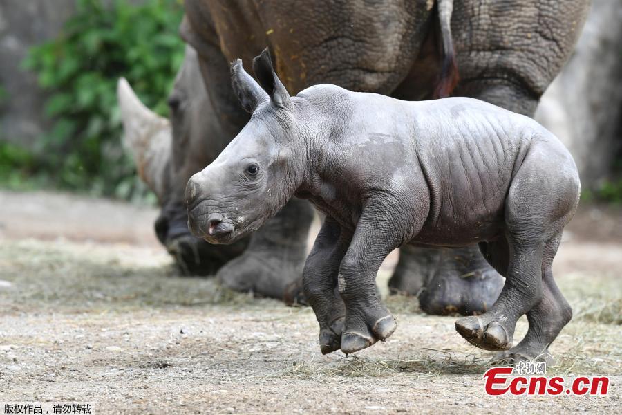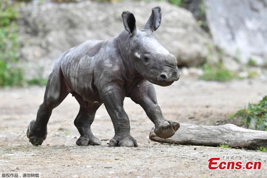 A three days old white rhino runs in its enclosure at the zoo in Salzburg, Austria, Saturday, June 6, 2020. The female calf was born to mother Tamu and will be named later. She weighed about 80 to 90 pounds. The calf is in good shape and could weigh anywhere from 3,500 to 5,500 pounds when fully grown. (Photo/Agencies)