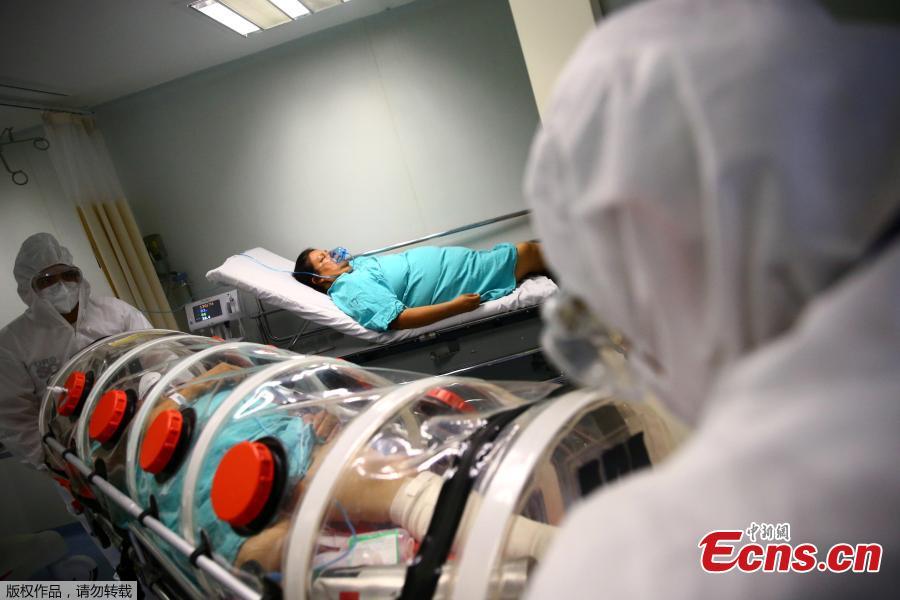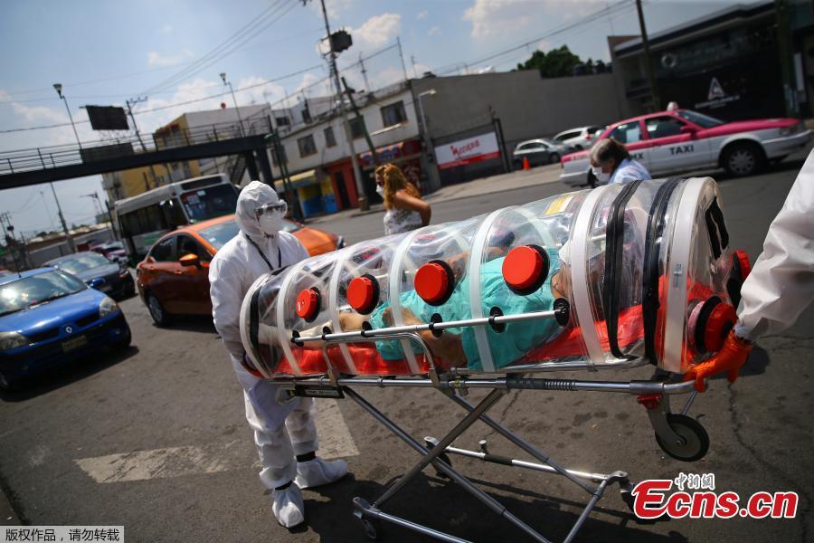 Photo shows a patient suffering from the coronavirus disease (COVID-19) inside a capsule as Red Cross paramedics transfer him from a hospital to another in Mexico City, Mexico, June 8, 2020. (Photo/Agencies)