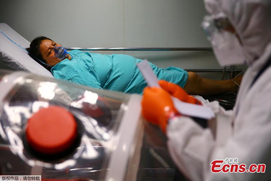 Photo shows a patient suffering from the coronavirus disease (COVID-19) looking to a Red Cross paramedic in a public hospital in Mexico City, Mexico, June 8, 2020. (Photo/Agencies)