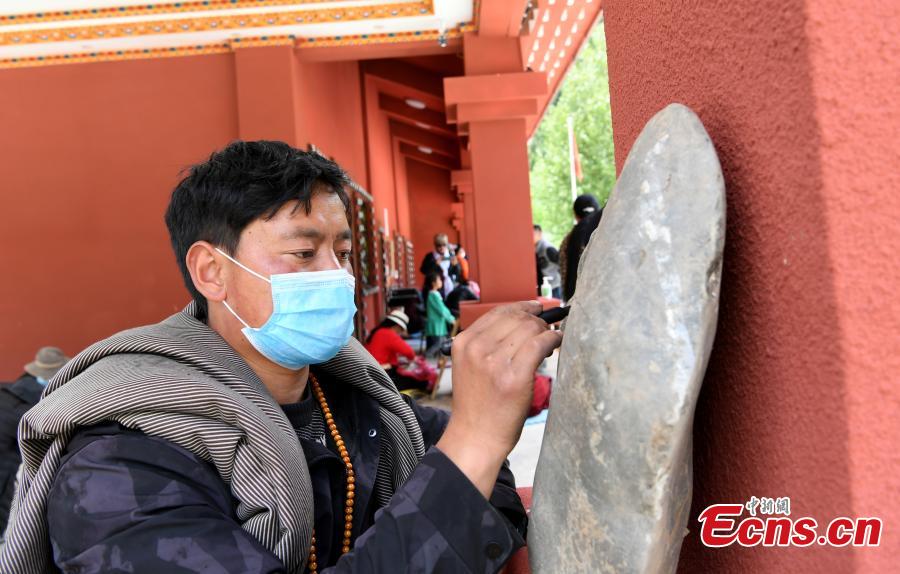 A craftsman engraves on a stone at a petroglyph park in Bangtuo, Rangtang County, Ngawa (Aba) Tibetan and Qiang Autonomous Prefecture in Southwest China's Sichuan Province, June 13, 2020. Established in 2017, the petroglyph park preserves relics with great historical value, like lamaist pagoda and Buddhist Stone Sutras. (Photo: China News Service/An Yuan)