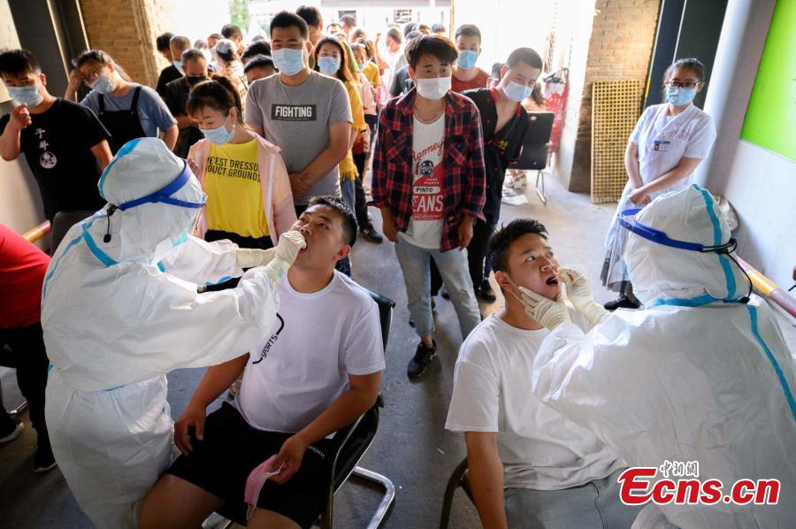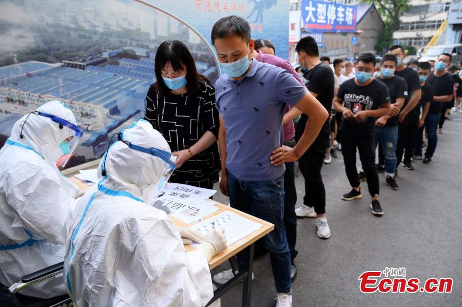 Staff of the Wulongkou seafood wholesale market line up for COVID-19 throat swab testing in Taiyuan City, northwest China’s Shanxi Province, June 15, 2020. After the novel coronavirus was reported in Beijing’s Xinfadi wholesale market, many wholesale markets across China have conducted virus detection and nucleic acid tests for staff members. At the Wulongkou market, about 4,000 workers have received nucleic acid tests by Monday. (Photo: China News Service/Wei Liang)