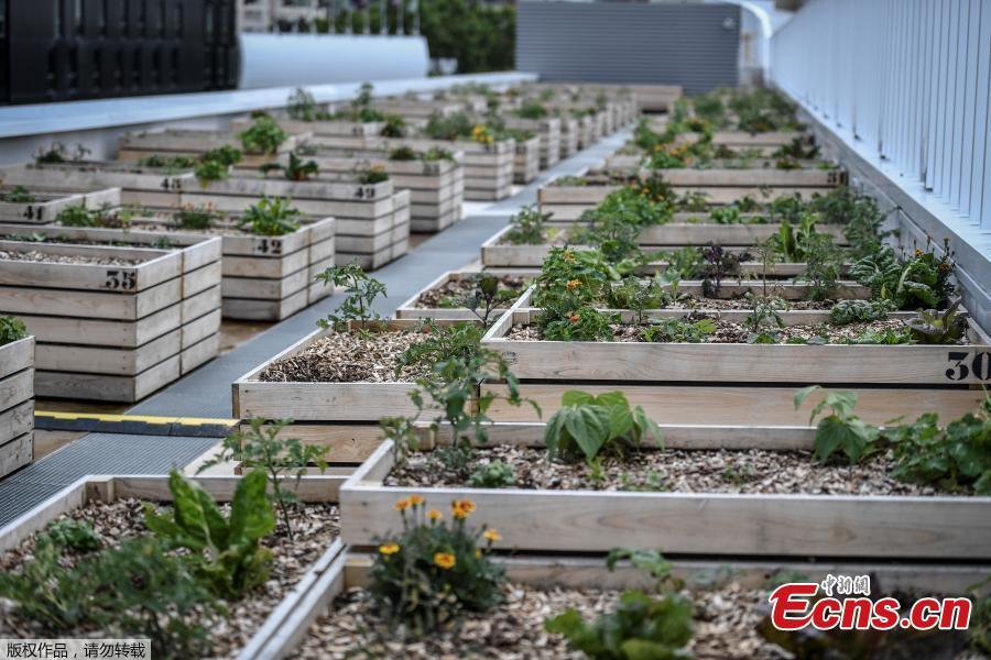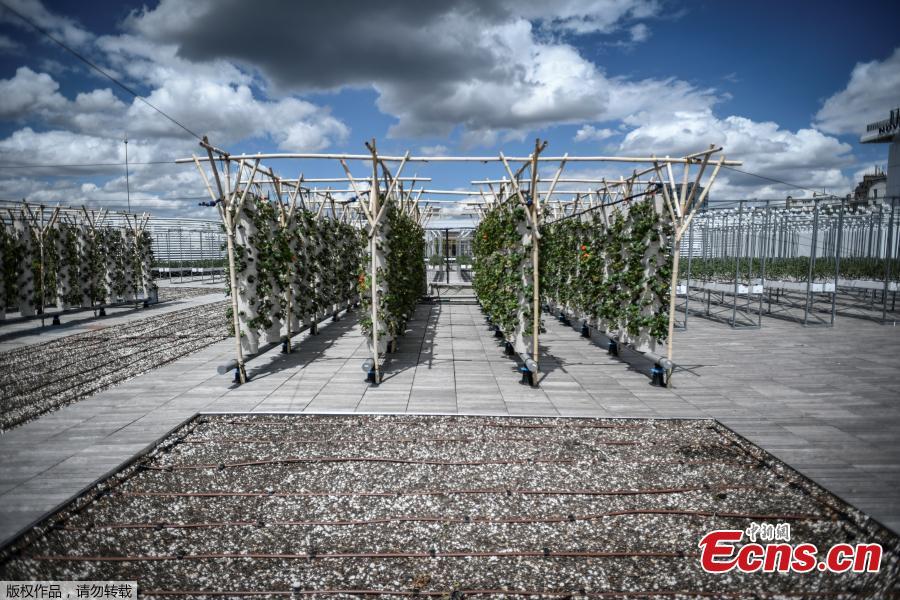 The photo taken on June 15, 2020 shows the roof of Paris Expo Porte de Versailles grows with green crops. Paris Expo Porte de Versailles, the popular exhibition center is set to become the world's largest urban rooftop farm with 14,000 square meters and open in July. Fruits, vegetables and herbs are the main crops of the farm, thanks to innovative cultivation techniques in aeroponics and hydroponics. (Photo/Agencies)