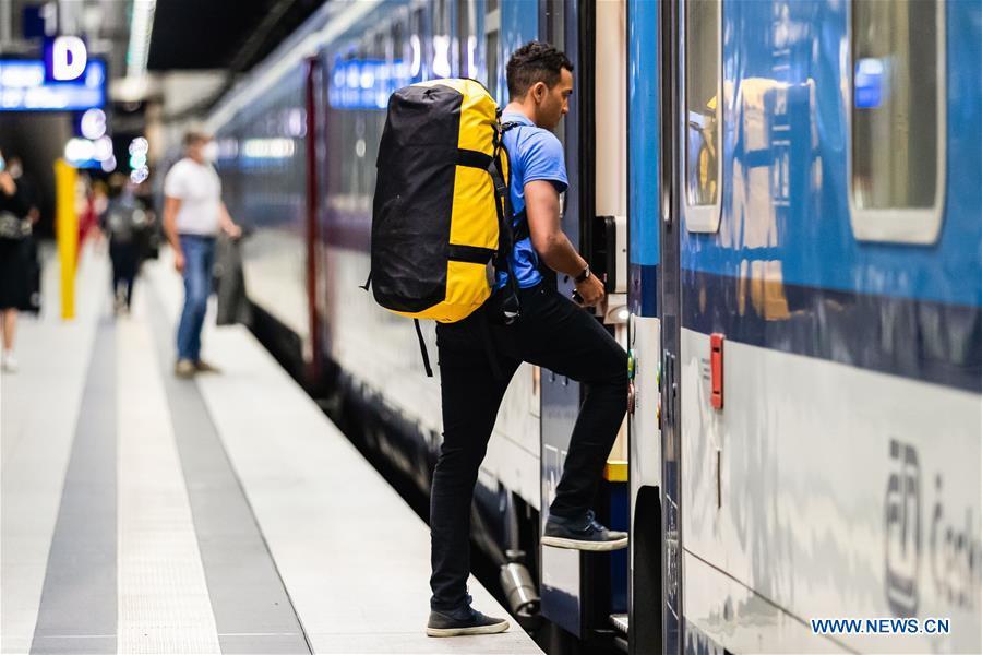 A passenger gets on a train to Prague of the Czech Republic at Berlin Central Train Station in Berlin, capital of Germany, June 15, 2020. The German government on Monday lifted its travel warnings for the European Union (EU) members, the Schengen-associated states and Britain, except Spain, Finland, Norway and Sweden. The warnings were replaced by individual travel advice. (Xinhua/Binh Truong)