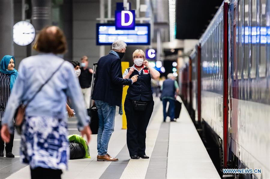 A working staffer (1st, R) wearing a face mask talks with a passenger at Berlin Central Train Station in Berlin, capital of Germany, June 15, 2020. The German government on Monday lifted its travel warnings for the European Union (EU) members, the Schengen-associated states and Britain, except Spain, Finland, Norway and Sweden. The warnings were replaced by individual travel advice. (Xinhua/Binh Truong)
