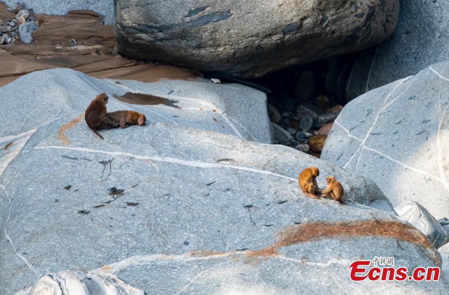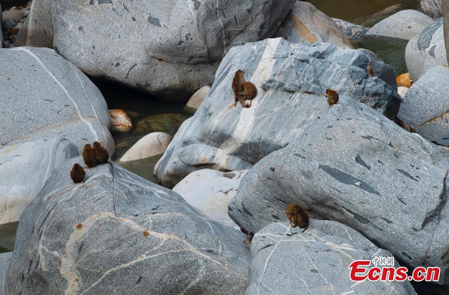 The undated photo shows assamese macaques party along the Daying river, Tongbiguan Nature Reserve, SW China’s Yunnan Province. A photographer shot pictures of 26 assamese macaques with a balanced age structure play in the reserve. Assamese macaques were defined as the first-class protected animal in China. (File photo/China News Service)