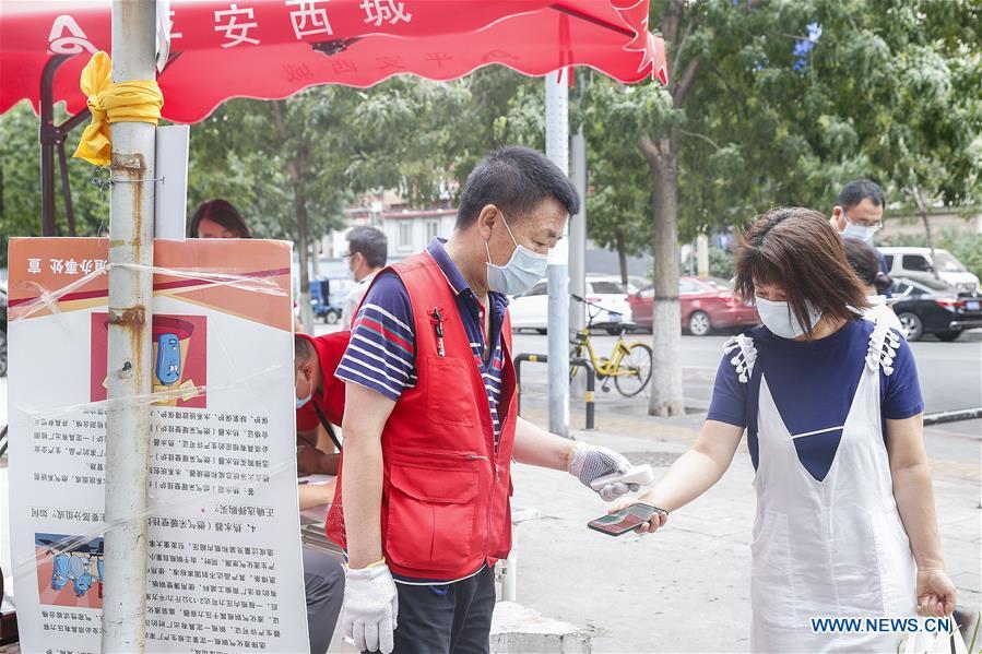 A community staff member checks a resident's body temperature at the entrance of a community in Xicheng District of Beijing, capital of China, June 17, 2020. Beijing has upgraded its emergency response to COVID-19 from Level III to Level II, the second-highest of the four-tier system, as the city is battling to contain new clusters of COVID-19. Following the upgrade of emergency response, closed-off management has been resumed in all communities in Beijing and those who seek to enter are required to go through four steps -- having their body temperature tested, showing a registered pass, having their health code checked and completing real-name registration, together with strict exit controls. (Xinhua/Zhang Yuwei)
