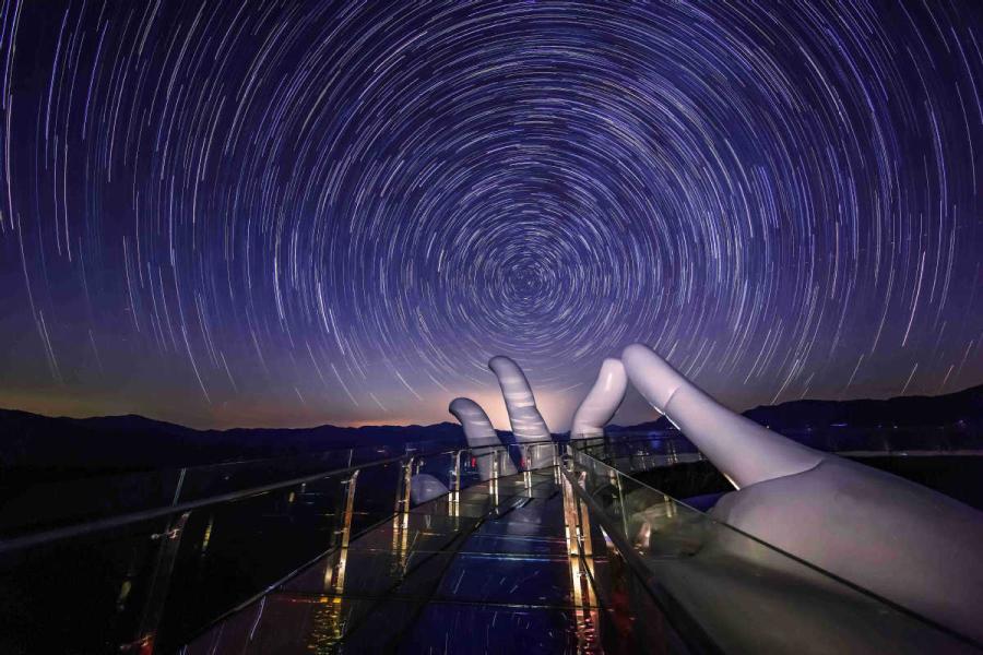 A 99-meter-long bridge supported by a huge "Buddha's hand", constructed above cliffs and located at an altitude of 1,000 meters in Guxi's Star River scenic spot, has become a top tourist destination in Youxi county, Fujian province, providing amazing sightseeing experiences as well as breathtaking scenery for photography.