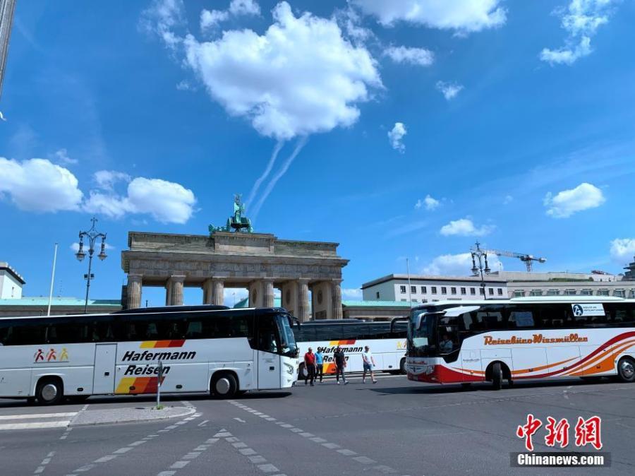 A parade of coaches take part in a protest in front of Brandenburg Gate on street June 17 for state aid for travel agencies, Berlin, Germany, June 17, 2020. Small and medium sized companies in the travel sector are feeling the pinch of the pandemic especially hard. (Photo/China News Service)