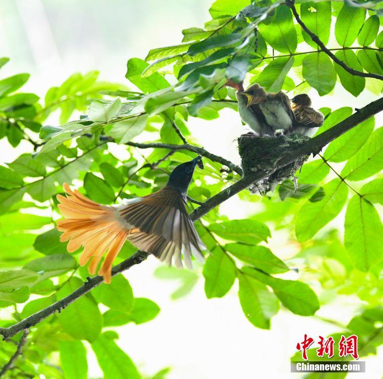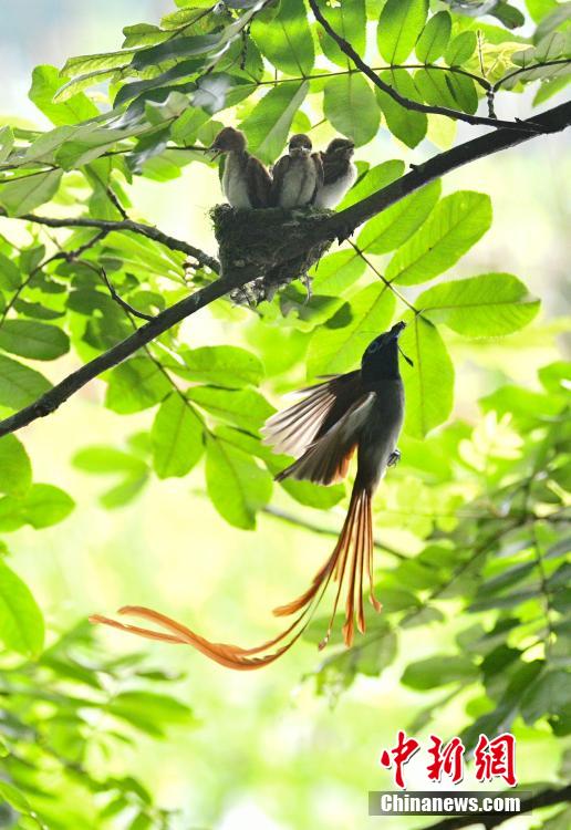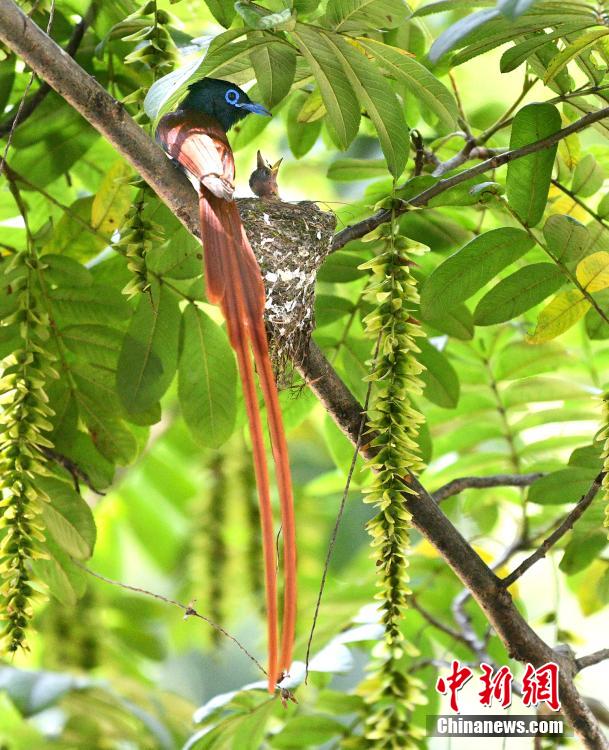 Photo shows a paradise flycatcher feeding its baby in Huanshan, east China's Anhui Province. Paradise flycatchers range across Africa and Asia. Their most telling characteristic are the males' long tail streamers. The paradise flycatchers are currently on the International Union for Conservation of Nature's list of critically endangered species. (Photo/China News Service)