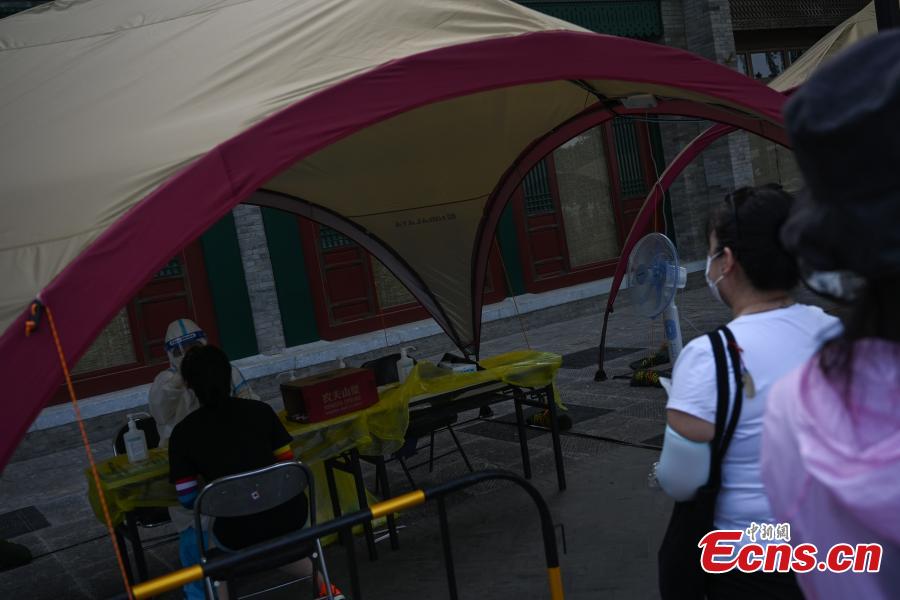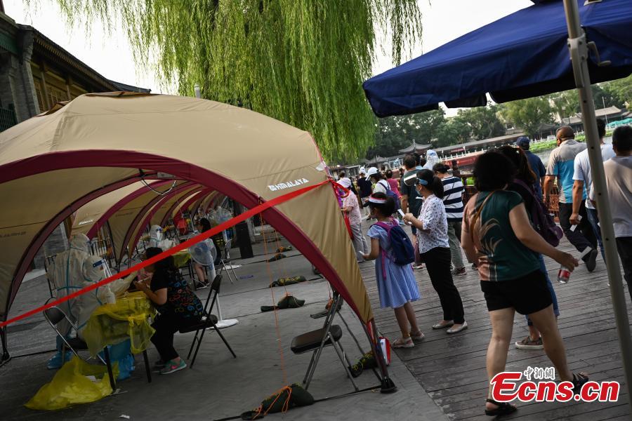Photo taken on June 21, 2020 shows people waiting for taking nucleic acid testing at Shichahai, Xicheng District, Beijing, capital of China. (Photo/China News Service)