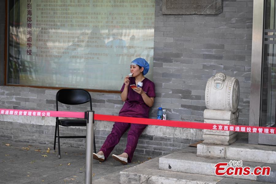 A medic takes a rest at the sample collecting post at Shichahai, Xicheng District, Beijing, capital of China, June 21, 2020. (Photo/China News Service)