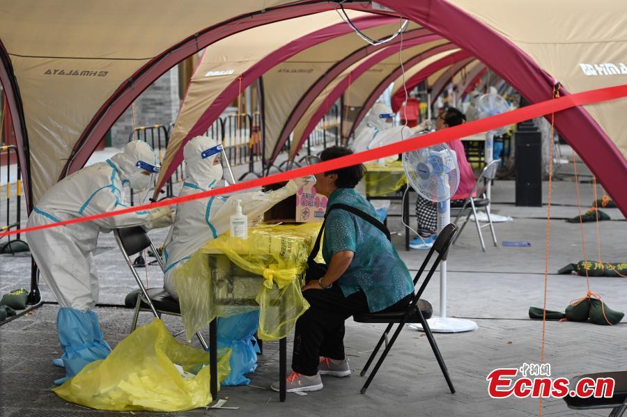 A medic takes sample from a citizen at the sample collecting post at Shichahai, Xicheng District, Beijing, capital of China, June 21, 2020. (Photo/China News Service)