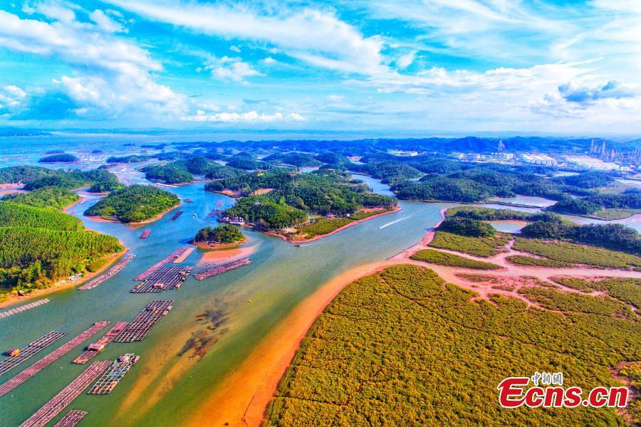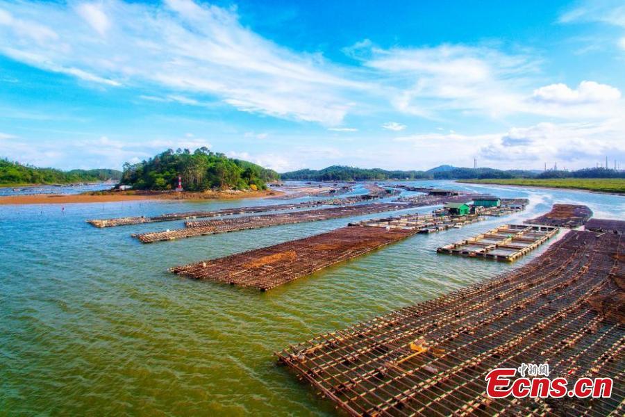 Aerial photo taken on June 21, 2020 shows the oyster cultivation fields in Qinzhou City, south China's Guangxi Zhuang Autonomous Region. With the advantage of the location of Maoweihai natural harbor, Qinzhou has developed an oyster industry which has a cultivation field of 158,000 Mu (about 10,533 hectares) and a complex output value of about 3,000 million Yuan (435.97 million US dollars). (Photo/China New Service)