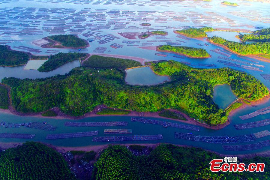 Photo taken on June 21, 2020 shows floating rafts for oyster culture in Qinzhou City, south China's Guangxi Zhuang Autonomous Region. (Photo/China New Service)