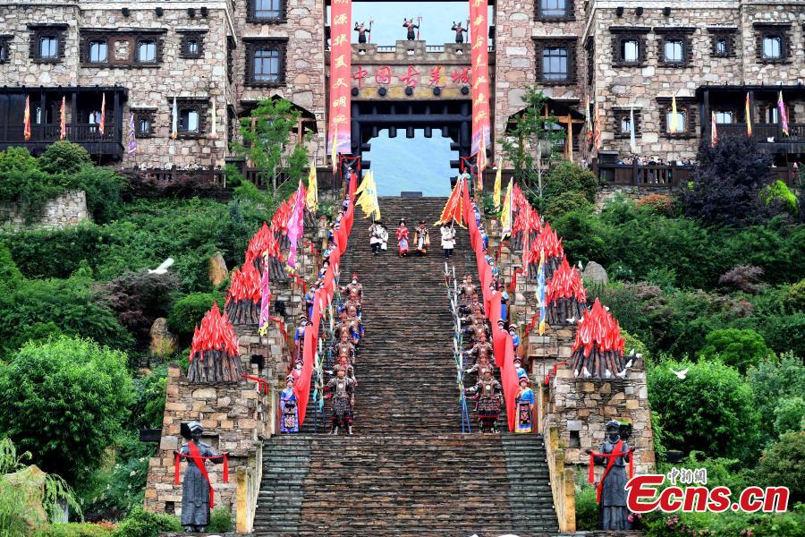 Photo taken on June 22, 2020 shows a traditional gate-opening ceremony held at the Ancient Qiang City of China in Maoxian county, Aba Tibetan and Qiang autonomous prefecture, Sichuan Province to welcome visitors. (Photo/China News Service)