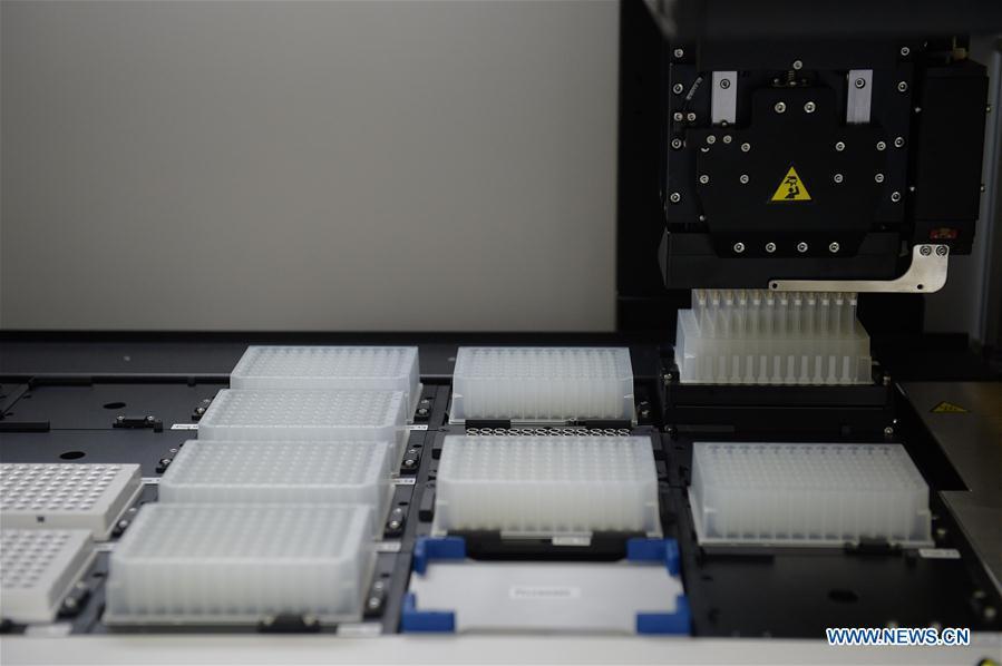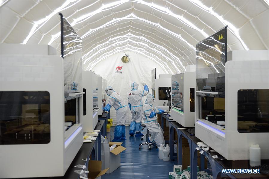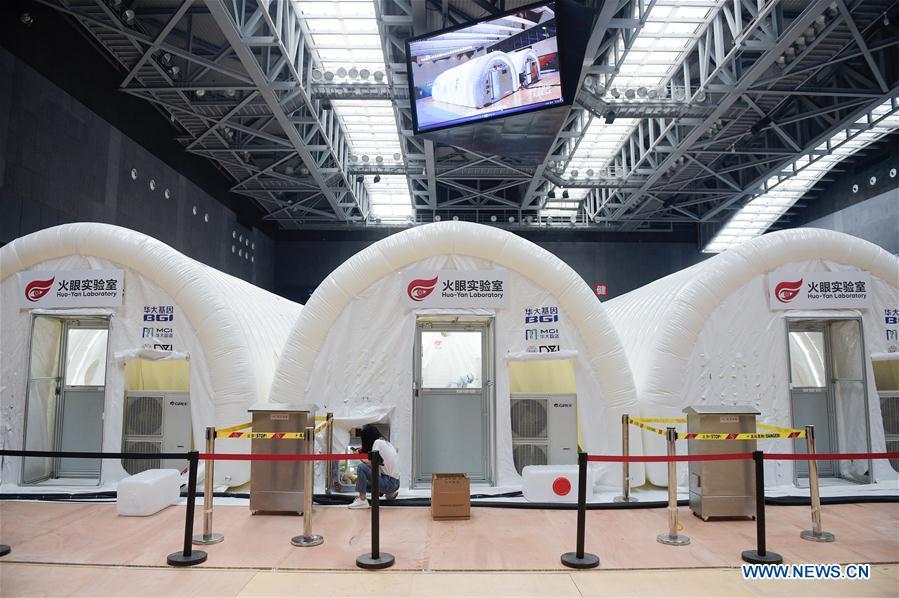 Devices are tested at a COVID-19 testing lab built with an air-inflated structure in Daxing District, Beijing, capital of China, June 22, 2020. A COVID-19 testing lab built with an air-inflated structure went into trial operation on Monday at a sports venue in Daxing District of Beijing to address the city's rising demand for nucleic acid tests after a cluster of infections were confirmed recently. The mobile Huoyan (Fire Eye) laboratory was built in two days over the weekend to accommodate 14 automated COVID-19 testing machines provided by Chinese biotech company BGI Genomics based in the city of Shenzhen, south China's Guangdong Province. (Xinhua/Peng Ziyang)