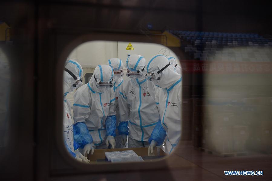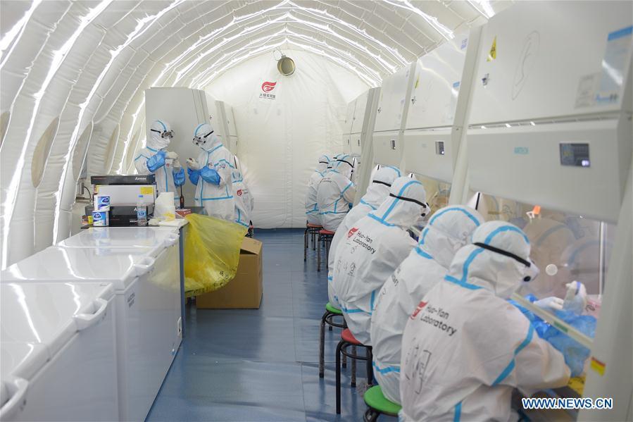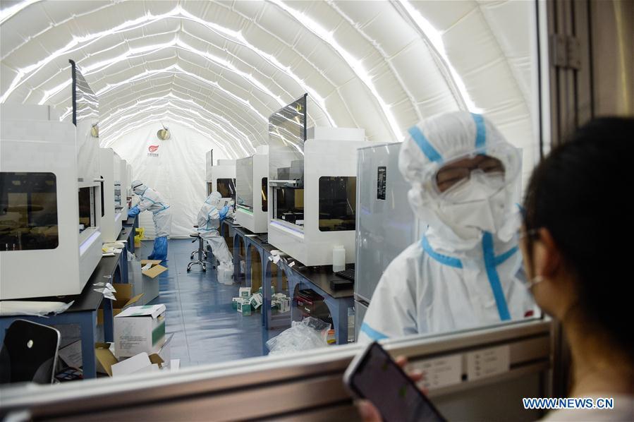 Members of staff work at a COVID-19 testing lab built with an air-inflated structure in Daxing District, Beijing, capital of China, June 22, 2020. A COVID-19 testing lab built with an air-inflated structure went into trial operation on Monday at a sports venue in Daxing District of Beijing to address the city's rising demand for nucleic acid tests after a cluster of infections were confirmed recently. The mobile Huoyan (Fire Eye) laboratory was built in two days over the weekend to accommodate 14 automated COVID-19 testing machines provided by Chinese biotech company BGI Genomics based in the city of Shenzhen, south China's Guangdong Province. (Xinhua/Peng Ziyang)