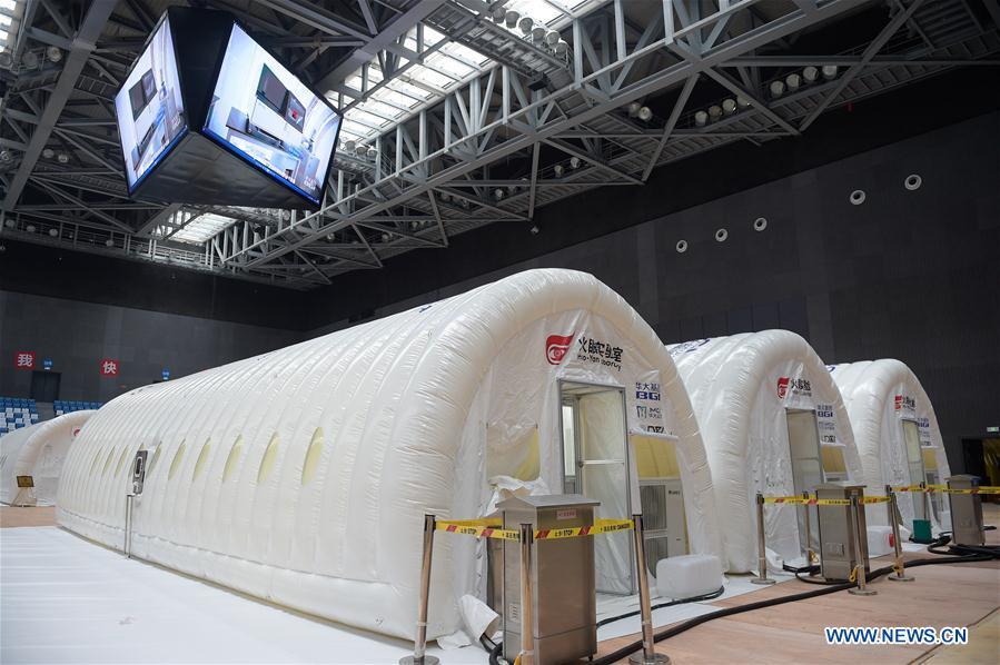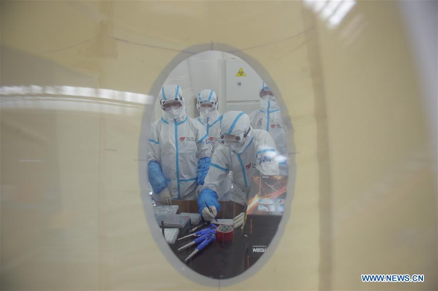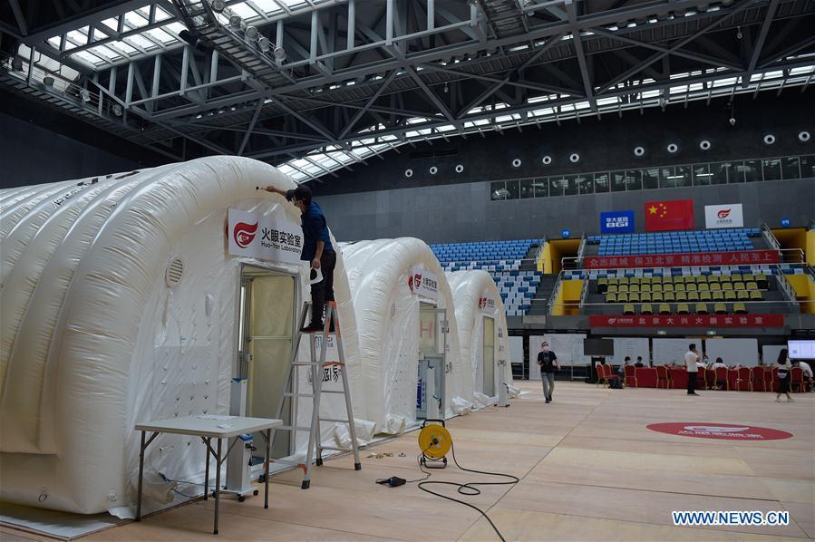 Members of staff make preparations at a COVID-19 testing lab built with an air-inflated structure in Daxing District, Beijing, capital of China, June 22, 2020. A COVID-19 testing lab built with an air-inflated structure went into trial operation on Monday at a sports venue in Daxing District of Beijing to address the city's rising demand for nucleic acid tests after a cluster of infections were confirmed recently. The mobile Huoyan (Fire Eye) laboratory was built in two days over the weekend to accommodate 14 automated COVID-19 testing machines provided by Chinese biotech company BGI Genomics based in the city of Shenzhen, south China's Guangdong Province. (Xinhua/Peng Ziyang)