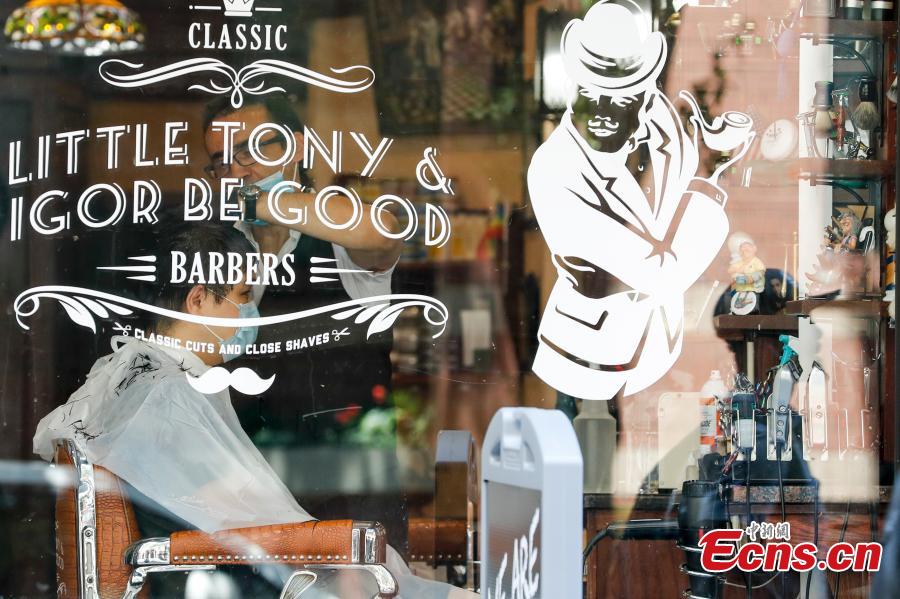A man has his hair cut at a barbershop in New York, the United States, on June 22, 2020. New York City entered phase two of reopening on Monday, marking a major milestone of the city's fight against COVID-19. The transitioning is "a giant step for this city" with the largest chunk of New York's economy reopening in phase two, as Mayor Bill de Blasio said, including barbershops, hair salons, real estate, vehicle sales and rentals. (Photo/China News Service)