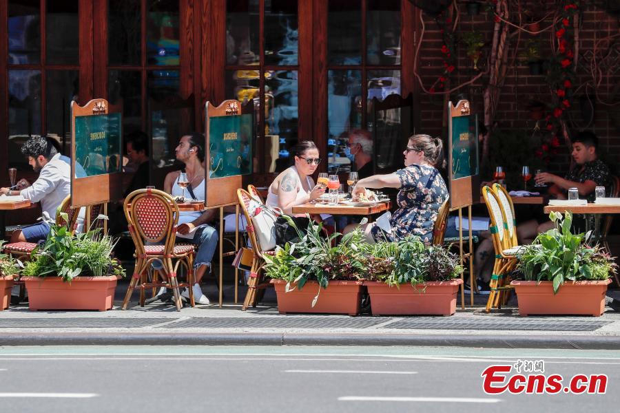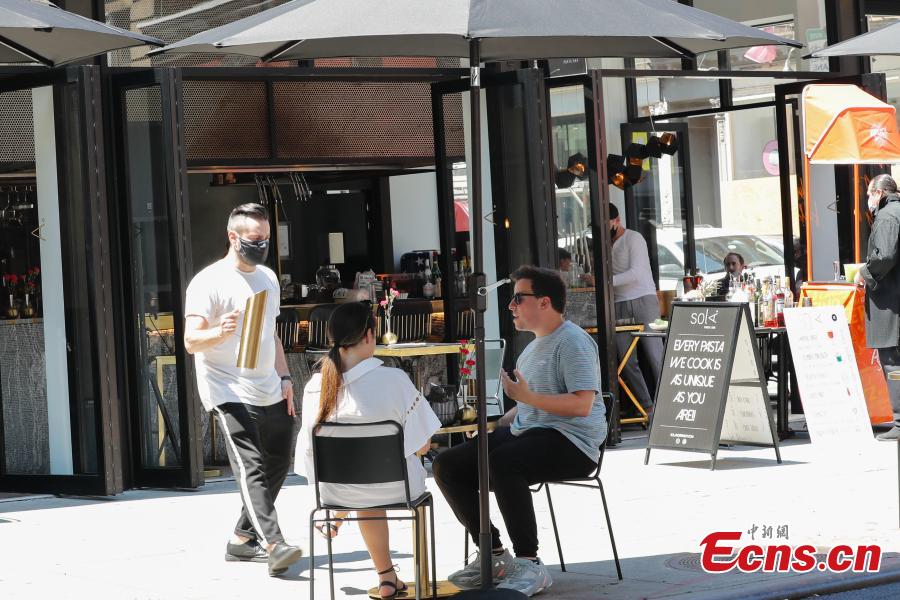 People sit at the outdoor dinning area of a restaurant in New York, the United States, on June 22, 2020. New York City entered phase two of reopening on Monday, marking a major milestone of the city's fight against COVID-19. The transitioning is "a giant step for this city" with the largest chunk of New York's economy reopening in phase two, as Mayor Bill de Blasio said, including barbershops, hair salons, real estate, vehicle sales and rentals.