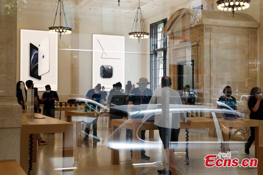 Customer shop at an Apple store on Fifth Avenue of New York City, the United States. New York City entered phase two of reopening on Monday, marking a major milestone of the city's fight against COVID-19. The transitioning is "a giant step for this city" with the largest chunk of New York's economy reopening in phase two, as Mayor Bill de Blasio said, including barbershops, hair salons, real estate, vehicle sales and rentals. (Photo/China News Service)