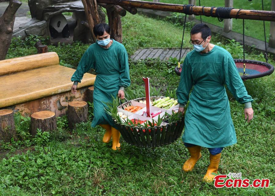 Photo taken on June 23, 2020 shows the special cake made of bamboo leaves, bamboo shoots, apples and carrots for the four giant panda cubs. (Photo/China News Service)