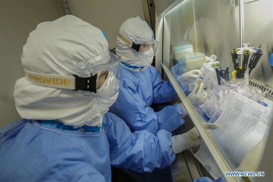 Medical workers work at the polymerase chain reaction (PCR) laboratory in Beijing Puren Hospital in Beijing, capital of China, June 23, 2020. The PCR lab was put into use on June 15 to conduct nucleic acid testing for COVID-19. (Xinhua/Zhang Yuwei)