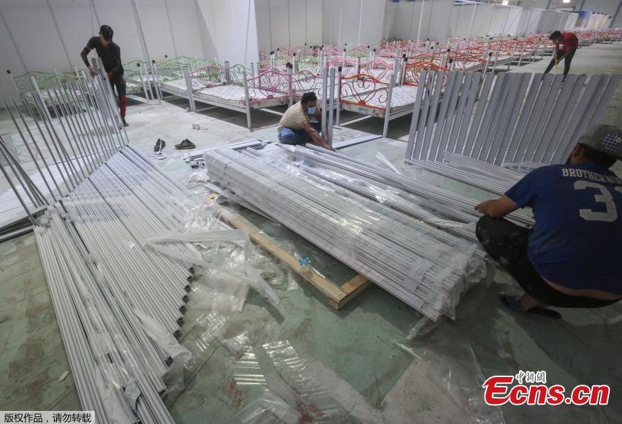 Workers construct a temporary hospital in the building for Baghdad International Fair in Baghdad, Iraq, on June 22, 2020. Iraqi Health Minister Hassan al-Tamimi said on Monday that the country is nearing the peak stage of COVID-19 infections. Iraqi Health Ministry reported 1,808 new coronavirus cases, bringing the total number of infections to 32,676. (Photo/Agencies)