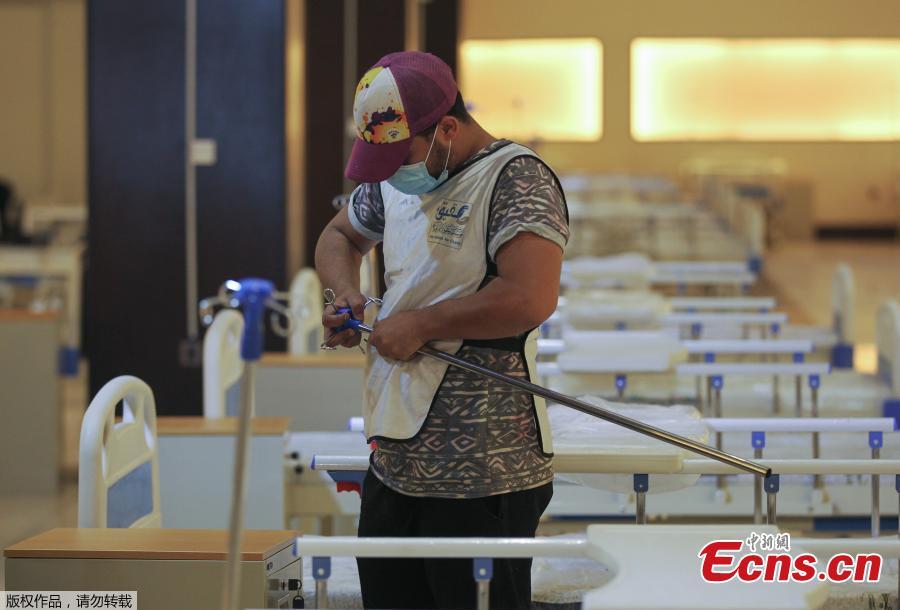 A worker constructs a temporary hospital in the building for Baghdad International Fair in Baghdad, Iraq, on June 22, 2020. Iraqi Health Minister Hassan al-Tamimi said on Monday that the country is nearing the peak stage of COVID-19 infections. Iraqi Health Ministry reported 1,808 new coronavirus cases, bringing the total number of infections to 32,676. (Photo/Agencies)