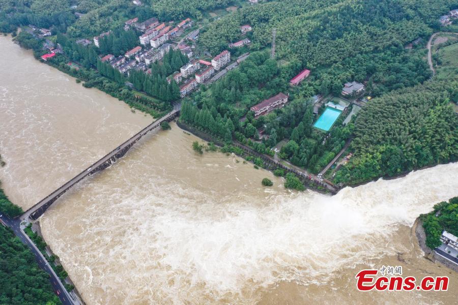 Aerial photo taken on June 23, 2020 shows the Mozitan dam discharging flood at Huoshan County, east China's Anhui Province. According to the local authority, some reservoirs in Anhui Province have seen a big rise in water levels as a result of heavy rainfalls in recent days. There are 266 reservoirs in Anhui, whose water levels have all surpassed the flood control level, discharging water as required. (Photo/China News Service)