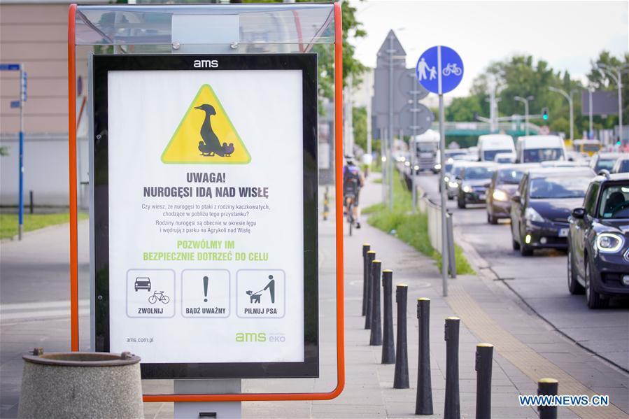 An advertisement at a bus stop is seen warning people of ducks crossing local roads in Warsaw, Poland, on June 23, 2020 . Initiatives were taken to warn cyclists and pedestrians to avoid ducks crossing the roads near the Royal Baths Park in Warsaw. (Photo by Jaap Arriens/Xinhua)