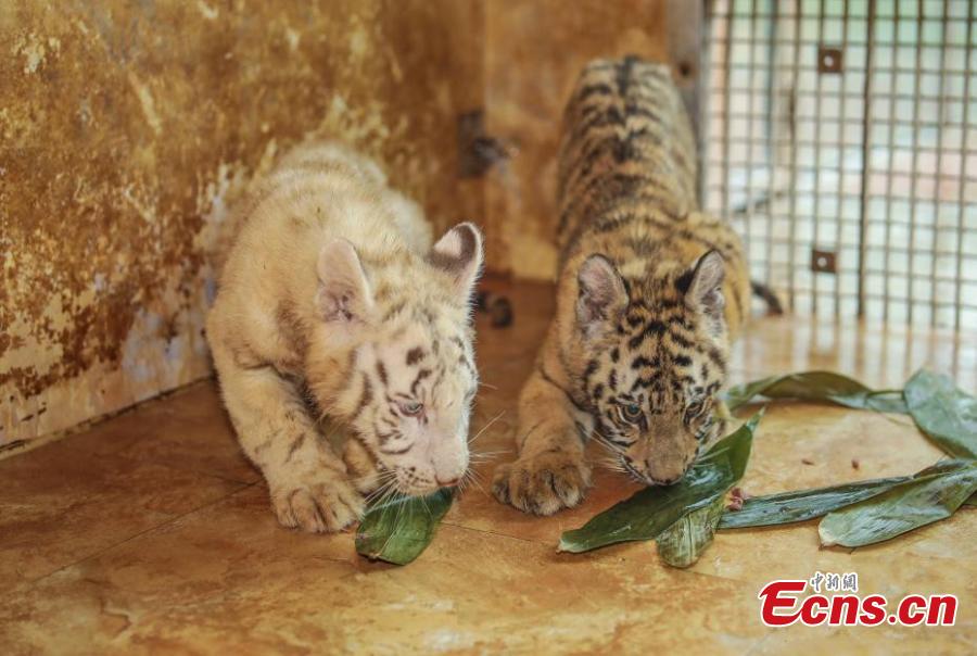 Tiger cubs try out zongzi, a traditional Chinese rice pudding, at a wildlife park in Rongchen, Shandong Province, June 24, 2020. This year's Dragon Boat Festival starts on June 25, 2020. (Photo/China News Service)