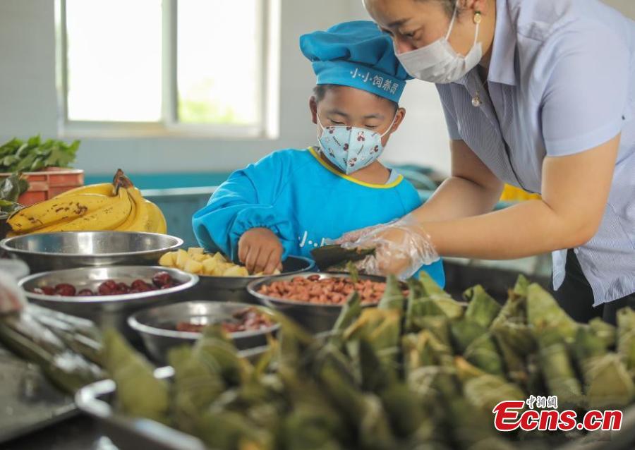 A staff memeber and a visitor make zongzi for animals at a wildlife park in Rongchen, Shandong Province, June 24, 2020. This year's Dragon Boat Festival starts on June 25, 2020. (Photo/China News Service)
