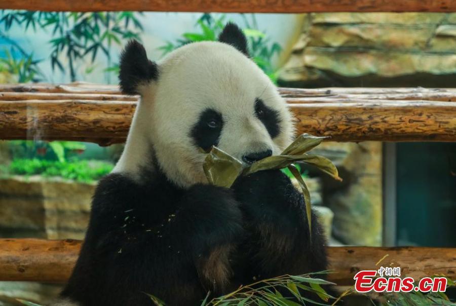 A giant panda enjoy a zongzi, a traditional Chinese rice pudding, at a wildlife park in Rongchen, Shandong Province, June 24, 2020. This year's Dragon Boat Festival starts on June 25, 2020. (Photo/China News Service)